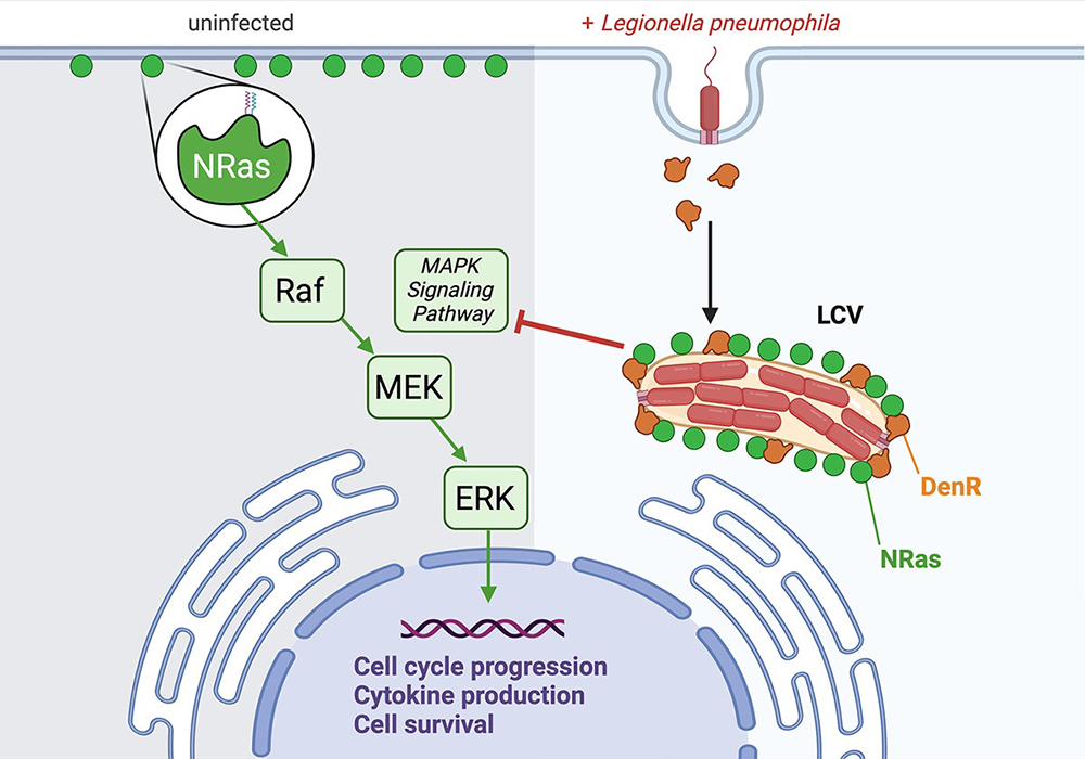 The Legionella pneumophila effector DenR hijacks the host NRas proto-oncoprotein to downregulate MAPK signaling.