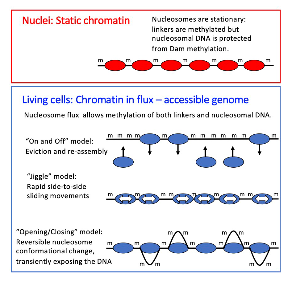 We propose that nucleosomes are stationary in nuclei, protecting the DNA they contain (top panel). The Dam DNA methyltransferase only methylates the short stretches of linker DNA between regularly spaced nucleosomes. However, in living cells, Dam methylates virtually the entire genome (bottom panel), because the nucleosomes are in flux. Nucleosomes may be continuously removed and replaced, or shunted from side to side, or opened up, as shown, resulting in DNA exposure and methylation. We propose that the flux is generated by the competing activities of the various ATP–dependent chromatin remodelers (such as RSC, SWI/SNF, ISW1, and CHD1). Adapted from Reference 3.
