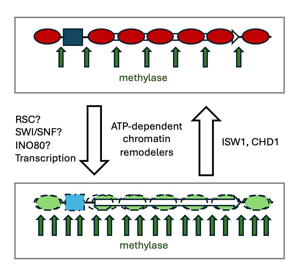 We continued our investigation of the roles of ATP–dependent chromatin remodelers in maintaining nucleosome dynamics in living yeast cells by focusing on the ISW1 and CHD1 nucleosome-spacing enzymes [Reference 2]. We found that ISW1 and CHD1 together suppress nucleosome dynamics in living cells, that is, the genome is methylated faster in the absence of both remodeling enzymes. We propose that ISW1 and CHD1 slide nucleosomes to create an ordered spaced nucleosome array (i.e., the 'beads on a string') and to suppress histone exchange (the cycle of histone removal from DNA and their replacement), resulting in reduced nucleosome dynamics and therefore in slower DNA methylation. In the absence of ISW1 and CHD1, their nucleosome-sliding activities are lost but histone exchange increases, perhaps attributable to a nucleosome flux–creating remodeler, resulting in an overall increase in dynamics and methylation rate. Our working model is shown in Figure 3. Currently, we are testing various aspects of our nucleosome dynamics model in yeast and in human cell lines.