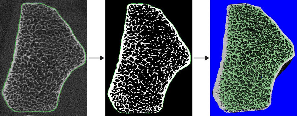 High-resolution peripheral quantitative computed tomography (HRpQCT) is a non-invasive, low-dose 3D imaging method that affords assessments of volumetric bone mineral density and bone microarchitecture of peripheral skeletal sites, including the distal radius and distal tibia. HRpQCT has the ability to differentiate between cortical and trabecular compartments of the skeleton, providing information on both bone density and structural parameters. It is a research tool that has been found to improve the prediction of fracture risk in studies of primary and secondary osteoporosis, as well as of endocrine disorders and rare diseases that affect bone. Our lab is one of only 28 centers in North America that has an HRpQCT scanner. Low-dose radiation exposure, non-invasiveness, and high resolution make HRpQCT a valuable tool in bone research. In several chronic-disease models, we are examining the relationship between failure load (loss of load-carrying capacity), fracture risk, and other HRpQCT–derived outcomes.