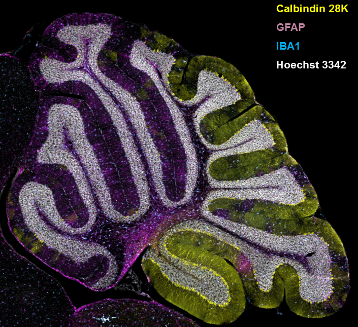 Immuno-staining of a sagittal section from the cerebellum of an NPC1–mutant mouse. Cerebellar Purkinje neurons are stained for calbindin 28K, and the expected loss of anterior Purkinje neurons is readily apparent. Expression of GFAP (glial fibrillary acidic protein) and IBA1 (ionized calcium binding adaptor molecule 1) are used to detect astrogliosis and microgliosis, respectively. Nuclei are stained with Hoechst 3342.