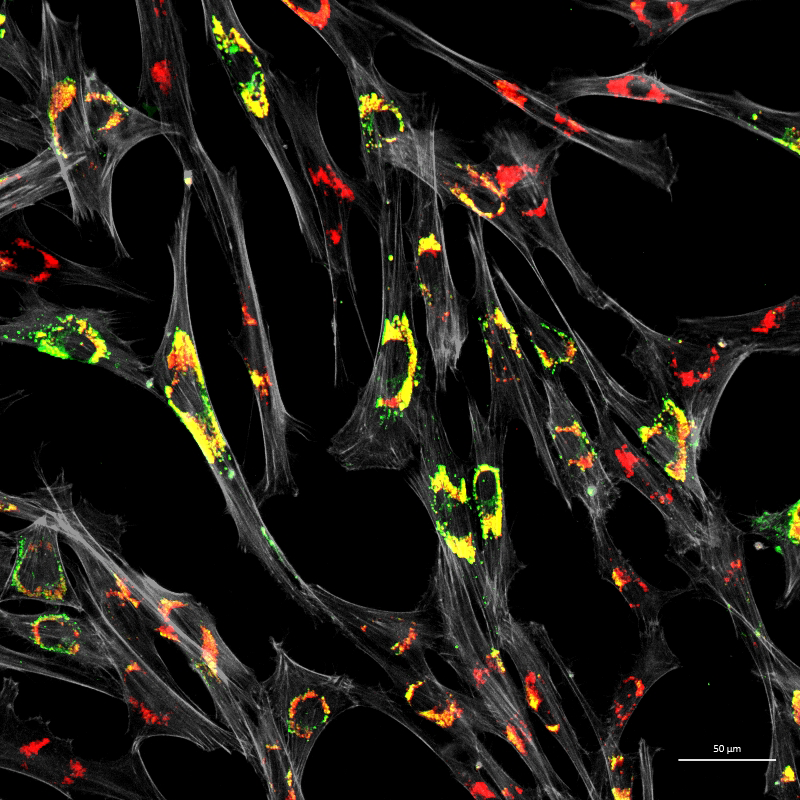 Human NPC1 fibroblasts were immuno-stained for Lamp1 (green) and stained with filipin (red); filipin stains unesterified cholesterol, which accumulates in the Lamp1–positive endolysosomal compartment. Cell structure was outlined by immuno-staining for actin (gray).