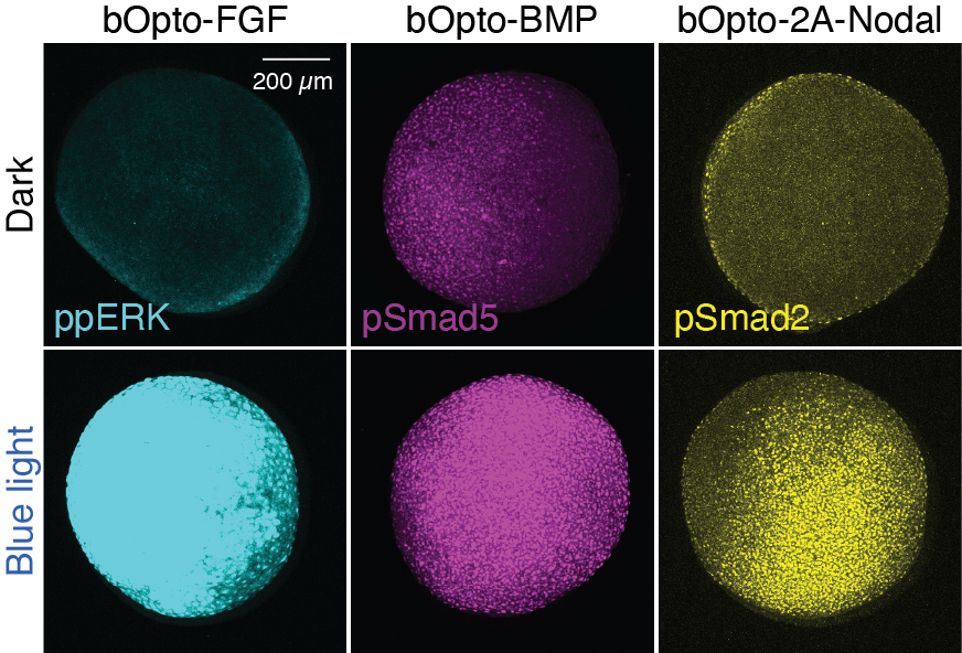 Gastrulating zebrafish embryos expressing optogenetic activators of FGF, BMP, and Nodal signaling were exposed to blue light (455 nm) for 30 min (bottom row) or maintained in dark conditions (top row). Immunofluorescence staining for phosphorylated signaling effectors demonstrates blue light–mediated signaling activation in vivo.