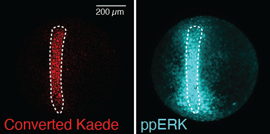 A zebrafish embryo expressing the optogenetic FGF activator and the photo-convertible fluorescent protein Kaede was locally illuminated (white dotted line) with 405 and 445 nm confocal lasers. Immunofluorescence staining for the FGF–signaling effector ppERK shows localized signaling activation overlapping with photo-converted Kaede.