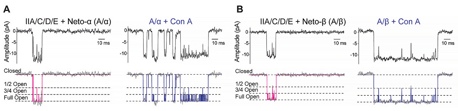 For example, inspection of single-channel records for type-A/Neto-α (A/α) and type-A/Neto-β (A/β) complexes revealed bursts of openings, during which the current fluctuated between the main state and well defined sub-conductance states with amplitudes of 75% and 50% (Figure 1); we did not observe openings to 25%, but it is possible that these might occur with lower concentrations of glutamate. The lectin concanavalin A (Con A) attenuates iGluR desensitization by binding at the interface between the amino-terminal domain and ligand-binding domain of iGluRs. Pretreatment with Con A dramatically increased single-channel activity without any change in single-channel conductance. We are currently expanding these single-channel kinetic analyses to gain mechanistic insights into the Neto-mediated modulation of postsynaptic glutamate receptors.