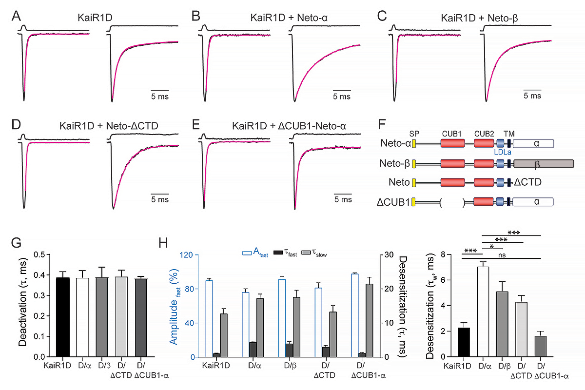 A–E: Responses to 10 mM glutamate applied for 1 ms (left traces) and 100 ms (right traces) to outside-out patches from cells transfected with KaiR1D alone (A) or together with Neto variants, Neto-α (B), Neto-β (C), Neto-ΔCTD (D) or ΔCUB1-Neto-α (E). Black lines show the average of 15–20 responses from one patch normalized and aligned to the peak. Red lines show decay of the responses fitted with the with the sum of one (deactivation) or two (desensitization) exponential functions; open tip junction currents measured at the end of the experiments are shown at the top of each panel. The holding potential was –60mV for all recordings.