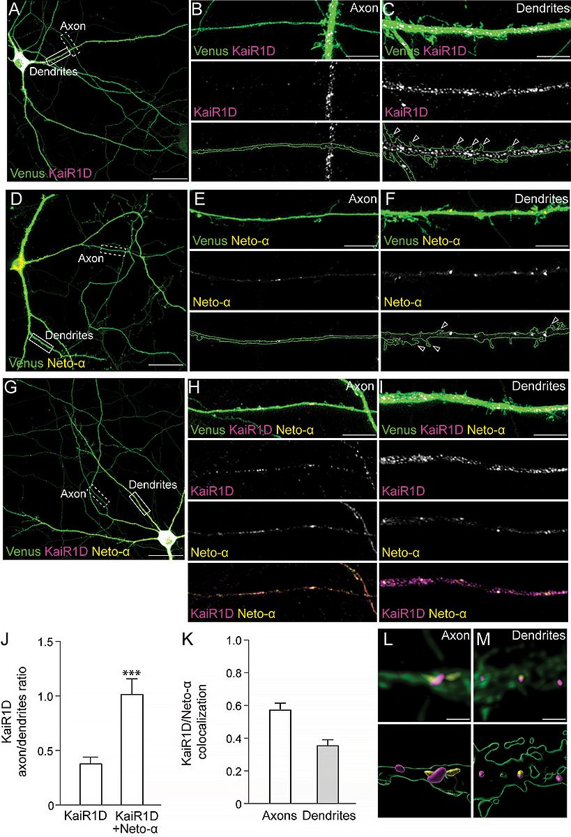 L–M: 3D reconstitution of subcellular localization of KaiR1D and Neto-α along the axon (L) or in the dendrites (M).