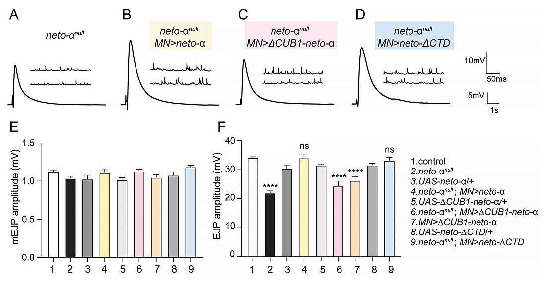 Figure 5. Neto-α CUB1 domain is essential for normal neurotransmission at larval NMJs (neuromuscular junctions).