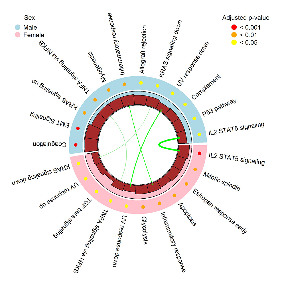 Outer track: enriched hallmark gene sets; middle track: adjusted p-value; orange bars in innermost track: number of overlapping genes between males and females; green lines: hallmark gene sets shared between males and females, with width proportional to number of shared genes. Source: Reference 1.