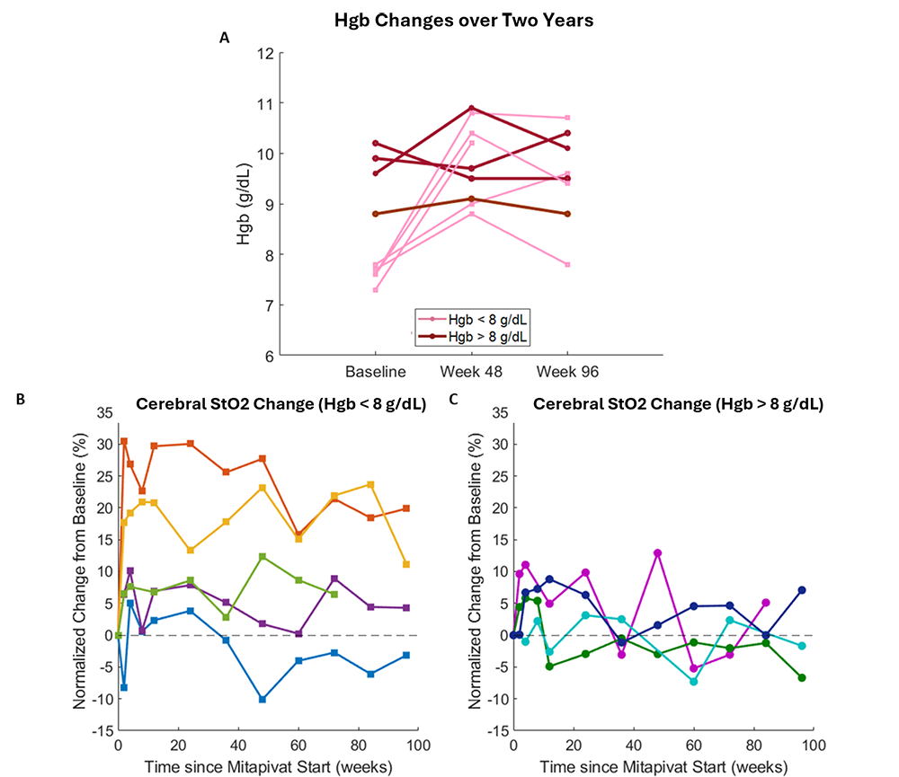 While being treated with mitapivat, patients with a lower baseline hemoglobin (Hgb) tended to have greater increases in Hgb and cerebral tissue oxygen saturation (StO2) within the first year compared with patients with Hgb over 8 g/dL. A: State plot of Hgb levels for nine patients at baseline and after 48 and 96 weeks on mitapivat. Patients with Hgb less than 8 g/dL (pink) tended to show a larger hemodynamic response to mitapivat than patients with Hgb over 8 g/dL (red). B: Changes in cerebral StO2 for patients with Hgb less than 8 g/dL. C: Changes in cerebral StO2 for patients with Hgb more than 8 g/dL.
