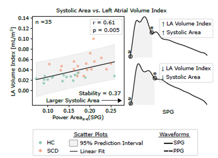 Our group's role is to assess the sensitivity of various optical devices to hemodynamic changes induced by SCD treatments and to evaluate whether the changes correlate with what is observed from blood chemistry. We have two manuscripts currently under preparation, which will be submitted sometime in 2026: one covers our monitoring of patients with SCD undergoing mitapivat; the second paper covers the results of our baseline study comparing the hemodynamic metrics of SCD patients with healthy volunteers. Additionally, we analyzed pulsatile waveforms from speckle plethysmography (SPG) to find associations between waveform morphological parameters and markers of cardiac health. These results are shown in Figures 1 and 2.
