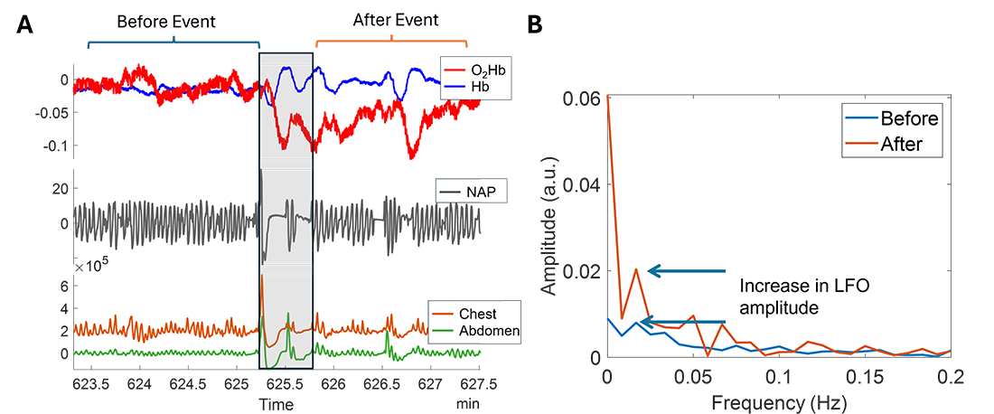 A: Changes in oxyhemoglobin (O2Hb, red) and deoxyhemoglobin (Hb, blue) measured by near-infrared spectroscopy in conjunction with nasal airway pressure (NAP) and movement sensors on chest (orange) and abdomen (green) during an apneic episode (gray box). During the episode itself, we observe decreasing O2Hb and increasing Hb, signifying increased oxygen consumption. B: A fast fourier transform (FFT) allows for display of the frequency content of the signal before (blue) and after (orange) the event. At low frequencies (f < 0.1 Hz), there is higher power observed post-apnea than in the pre-apneic period in the frequency range of 0.03 Hz to 0.07 Hz.