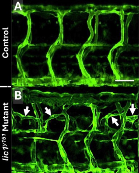 Over the years, we have used genetic screens in the zebrafish to identify mutants with defects in vascular growth, patterning, or integrity and have then characterized the defective genes in these mutants to uncover important new insights into genes and genetic pathways important for vessel growth and vascular-associated disease in humans [e.g., Pillay LM et al., Angiogenesis 2022;25:411]. Recently, we showed that a mutant we identified with vascular overgrowth (Figure 3) was caused by a defect in a gene required for intracellular transport of key pro-angiogenic cell surface receptors [Reference 4], highlighting the important role of intracellular trafficking in controlling receptor availability and resulting angiogenic potential. We also completed another study in 2025 characterizing the function of the human lymphatic disease gene Shoc2, showing that the function of this gene is absolutely required for the development of lymphatic vessels in the zebrafish and identifying a molecular pathway responsible for its activity in the lymphatic endothelial cells [Wilson P et al., bioRxiv 2025;doi: 10.1101/2025.03.26.645567:preprint].