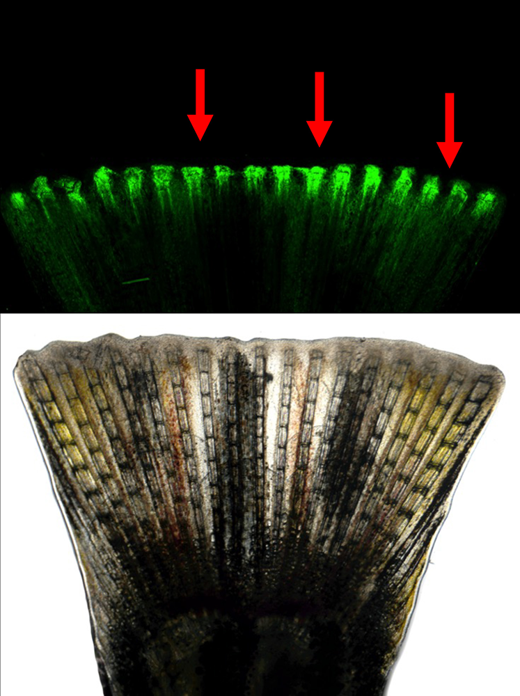 Green fluorescence (top) and transmitted light (bottom) imaging of a regenerating EpiTag zebrafish fin one day after amputation. EpiTag fluorescent GFPd2 expression is strongly activated in regenerating cells at the growing fin margin (red arrows). See Khor JM et al., bioRxiv, 2025; 10.1101/2025.04.21.649771.